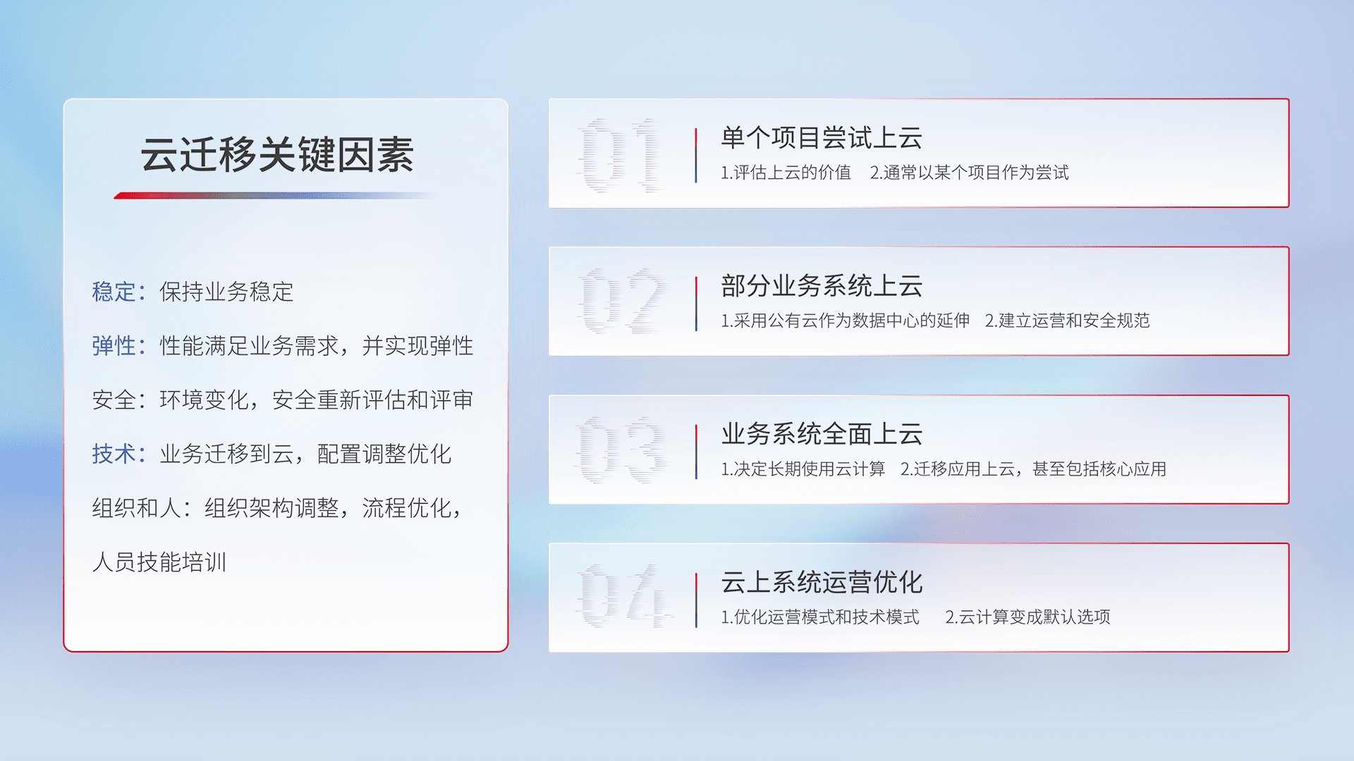 结合实际业务,,,,从规划设计、、、云平台选型、、、云原生改造、、、、数据迁移、、、、集成交付,,,,迁移全过程为客户识别最佳上云路径,,,做好风险识别管理,,设计网络架构、、、、身份权限、、、、安全审计合规、、、、操作审计、、日志审计、、、监控告警策略、、、多站点容灾设计等,,对云上基础设施进行整体规划,,,提升IT治理水平,,以满足弹性、、高可用、、、、高性能的需求。。