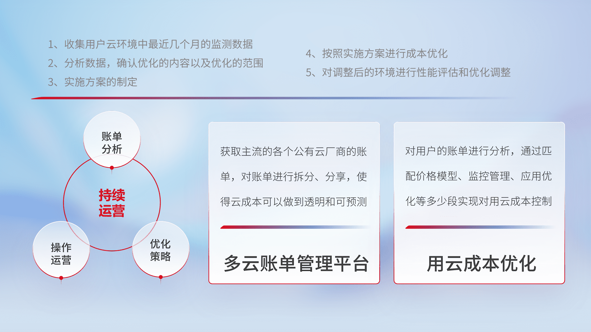 通过多云纳管,,,以统一的资源数据模型把客户的云资源进行抽象和封装,,进而实现对多云资源的统一操作,,保障云资源管理的可靠性、、、、稳定性与可用性。。量身定制化运维内容,,配置、、、、开发运维、、、、补丁管理、、、备份、、、监控、、、、认证和访问管理、、、、审计和日常巡检等,,,,保障在用云过程中的可靠度,,,稳定度以及高可用率。。